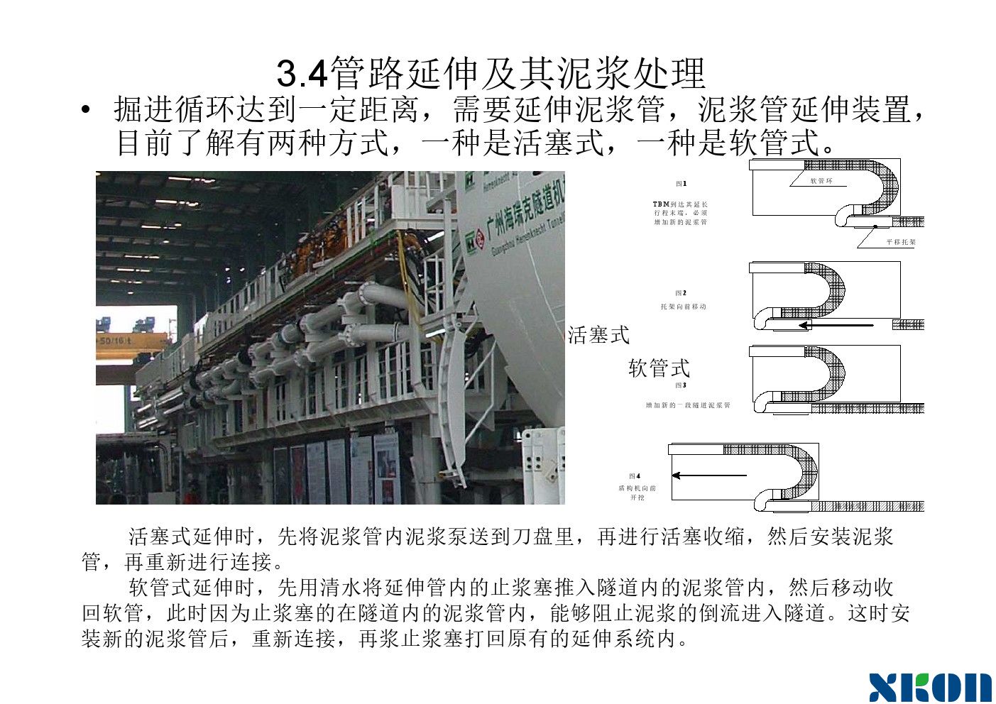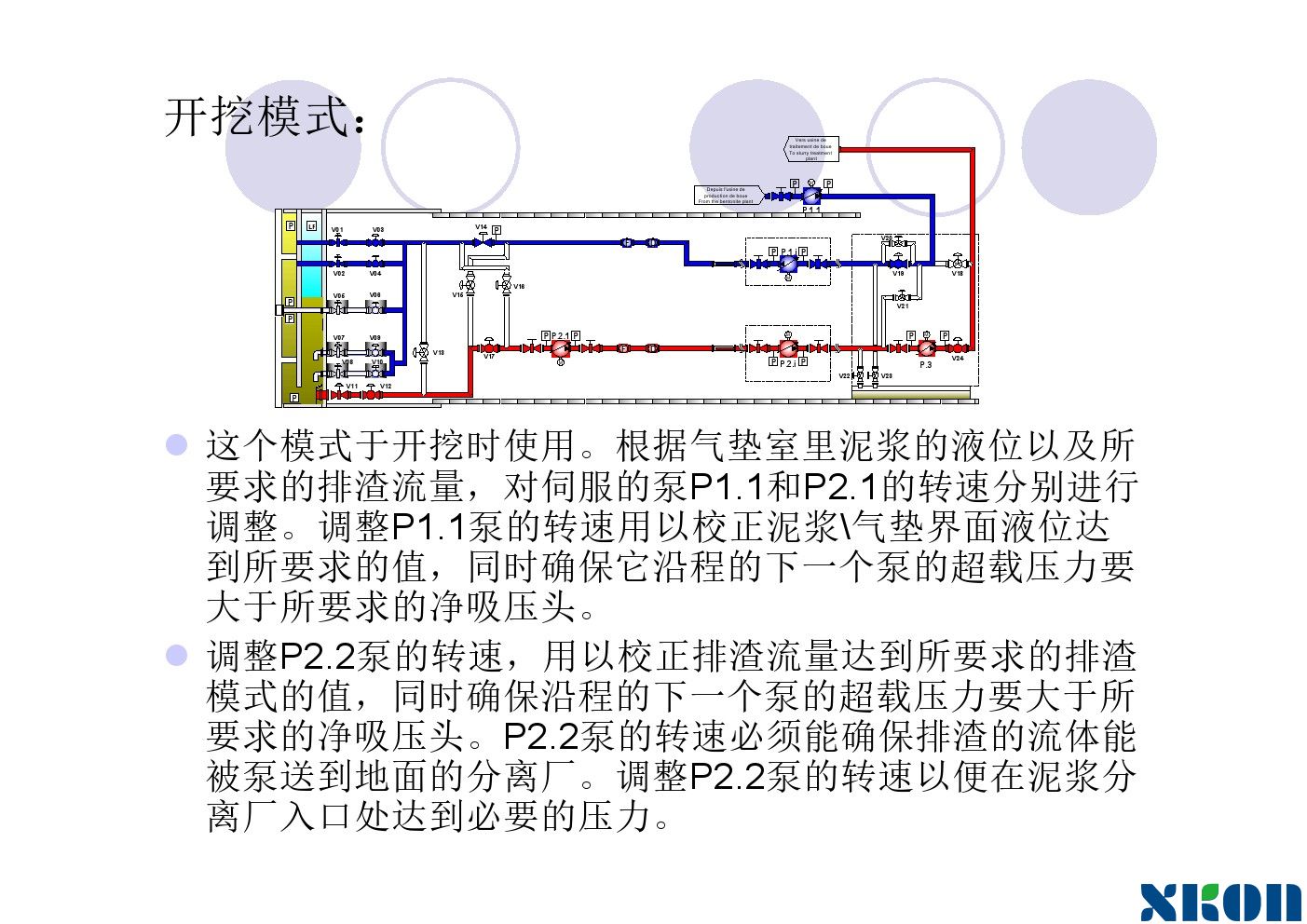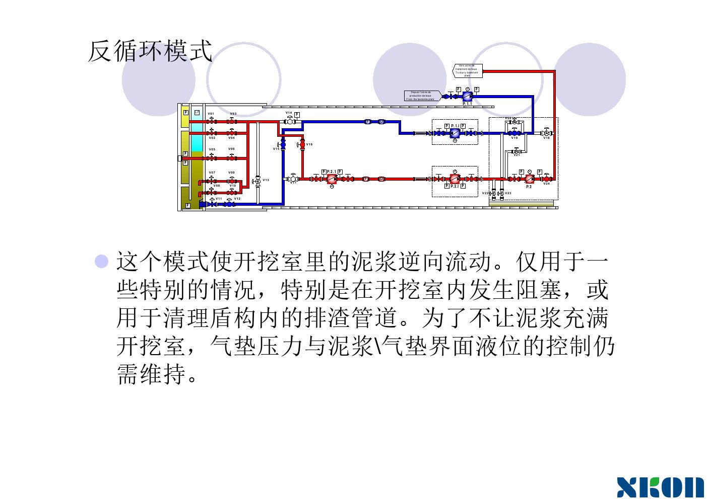 随着工具管的推进,刀盘在不断转动,进泥管不断供泥水,排泥管不断将混有弃土的泥水排出泥水舱。泥水舱要保持一定的压力。使刀盘在有泥水压力的情况下向前钻进。