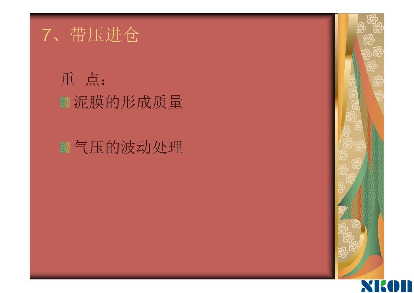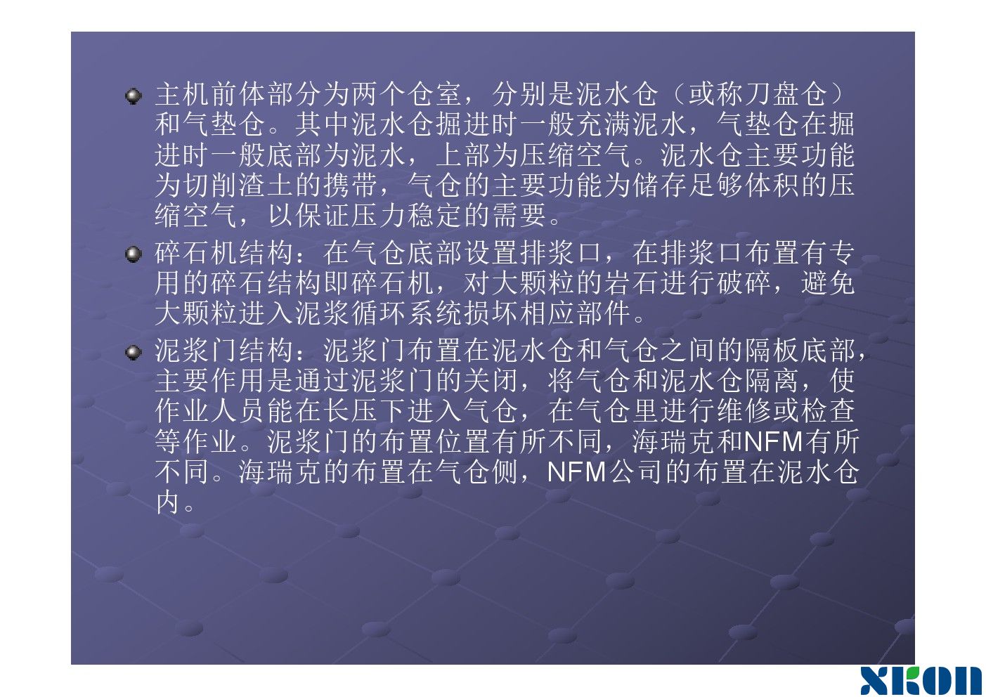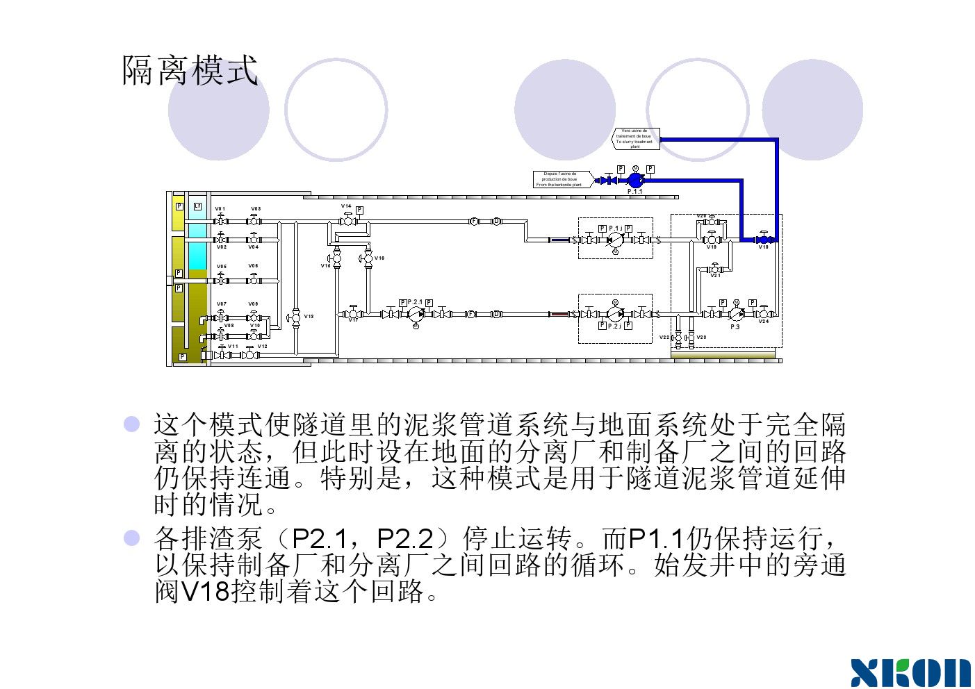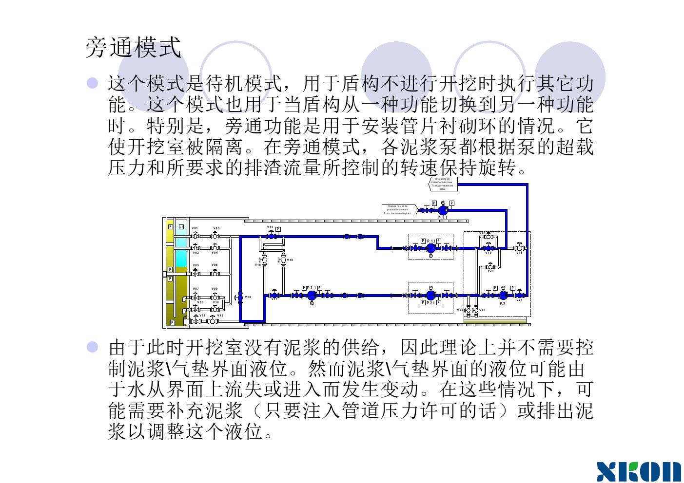 随着工具管的推进,刀盘在不断转动,进泥管不断供泥水,排泥管不断将混有弃土的泥水排出泥水舱。泥水舱要保持一定的压力。使刀盘在有泥水压力的情况下向前钻进。
