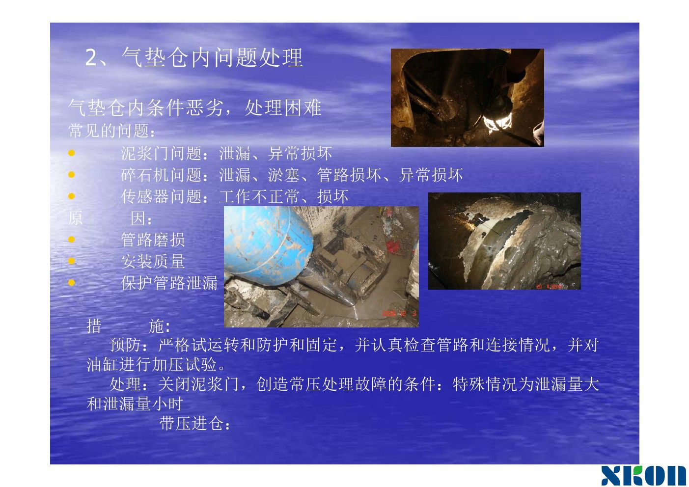 (1)当掘进机停止工作时,一定要防止泥水从土层中或洞口及其他地方流失。不然。挖掘面就会失稳,尤其是在出洞这一段时间内更应防止洞口止水圈漏水。